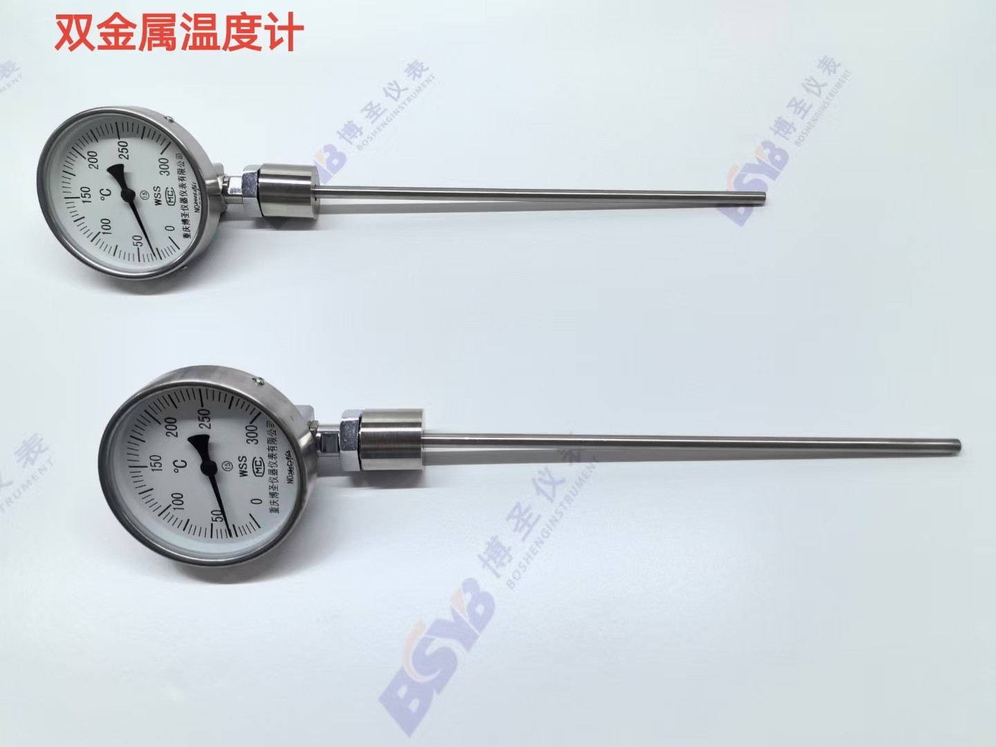 公司设计生产BSWSS工业双金属温度计,产品规格品种齐全,包含普通的双金属温度计,电接点式,万向型,带远传的双金属温度计和带4~20mA输出的双金属温度计。安装方式种类齐全,套管规格多,完全能够满足客户的定向需求。同时为了适应市场需求,设计双金属温度计与套管分离,以保证在不停机的前提下,更换双金属温度计。